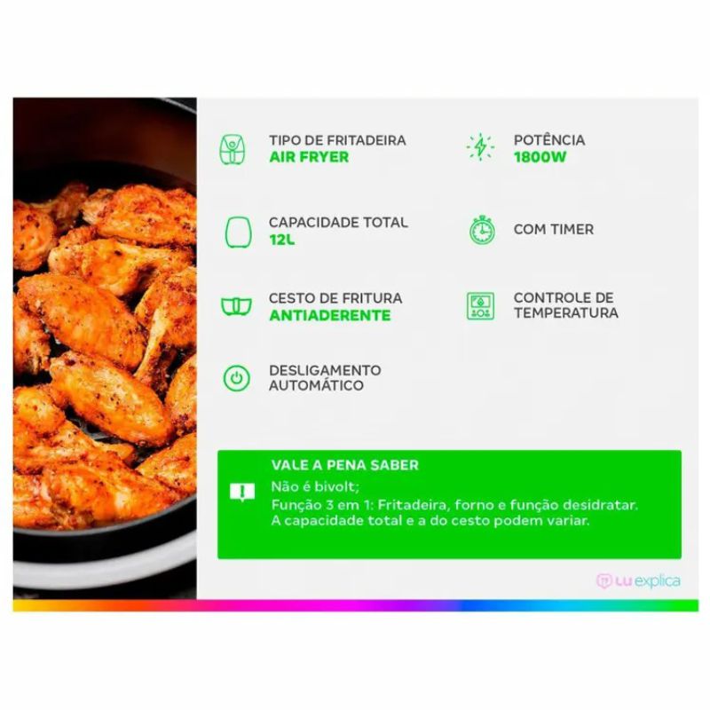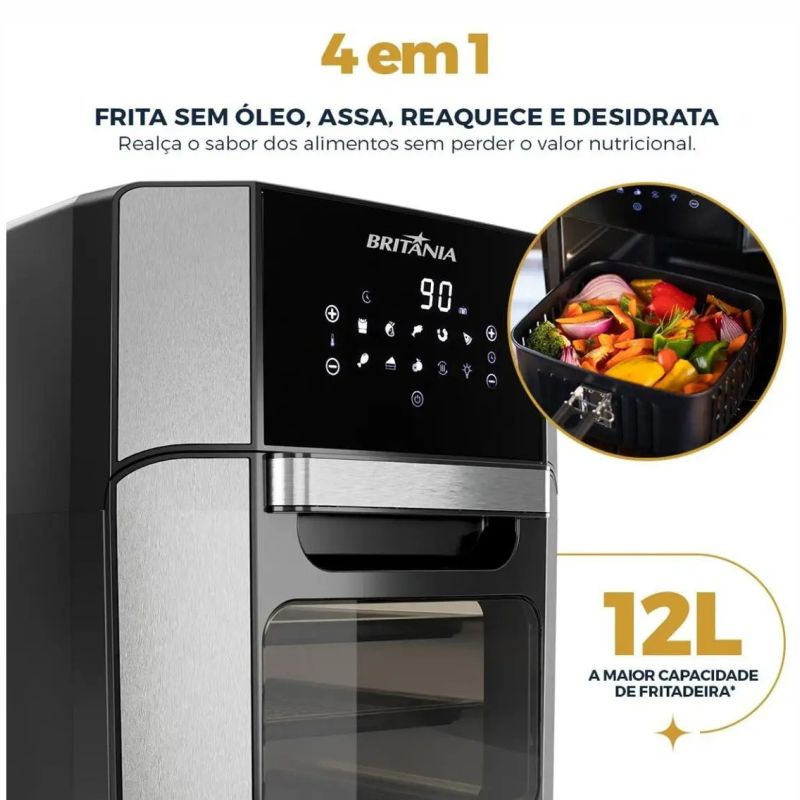 Inove nas receitas e torne seus momentos na cozinha muito mais saudáveis com a Fritadeira Elétrica sem Óleo/Air Fryer Oven BFR2100 da Britânia. Com 1800W de potência ela é 4 em 1. Isso porque ela frita sem óleo, assa, reaquece e desidrata, e tudo isso com painel digital e 9 funções que vão proporcionar total praticidade no seu dia a dia. Disponível na cor preta ela tem 12 litros de capacidade toral e tecnologia 360°Air Flow que é a circulação de ar quente em 360° que vai preparar suas receitas com mais eficiência e agilidade. Conta também com timer de 90 minutos com aviso sonoro e desligamento automático, luz interna e seletor de temperatura até 200°C. Com três prateleiras, ela faz tudo, ao mesmo tempo, por você, as três prateleiras dão a liberdade para preparar a refeição inteira de uma só vez. Esperar o hambúrguer ficar pronto, para depois fritar as batatinhas? Esperar o salmão, para só então preparar os chips? Com a Air Fryer Oven da Britânia, não precisa escolher qual fazer primeiro: ela faz tudo, ao mesmo tempo, por você. Porta com visor e iluminação interna, acompanhe o preparo de suas receitas sem precisar abrir a porta e saiba o momento exato em que sua comida está pronta para saboreá-la. Possui proteção contra superaquecimento, função Desidratar com tempo ajustável entre 2hrs a 24hrs e temperatura ajustável de 30°C a 80°C, acabamento em inox, base antiderrapante e acompanha 2 assadeiras perfuradas rasas e cesto antiaderente com alça removível. Se você busca a praticidade de um forno e a agilidade da air fryer, a Fritadeira Air Fryer Oven Britânia BFR2100 é perfeita para você!